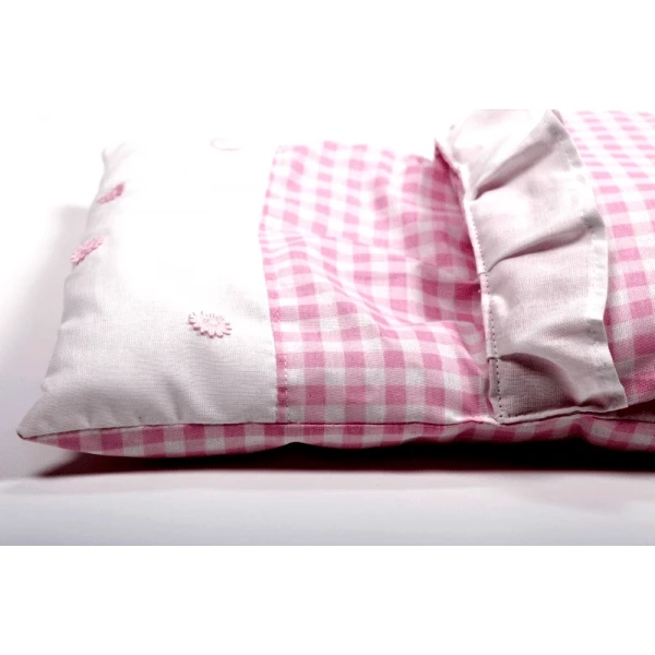 Prachtig slaapzakje, rose met wit geblokt, speciaal voor de houten poppenwagens. Past in de houten poppenwagen en poppenwagen de luxe.