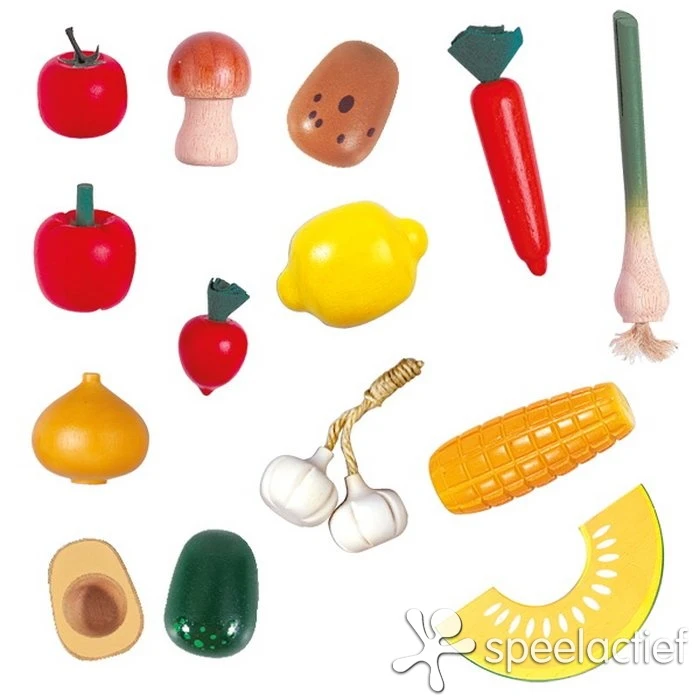 De set bestaat uit: 2 wortels, een rode paprika, champignon, ui, tomaat, groene paprika, radijsje, aardappel, knoflook, citroen, mais en prei.