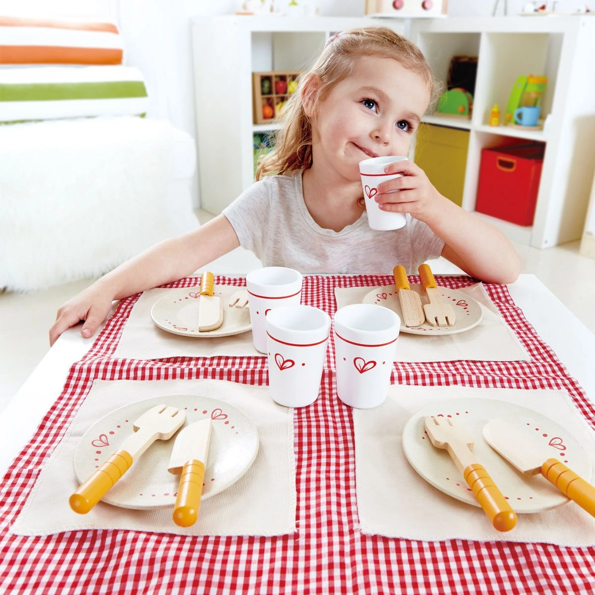 Complete set van 4 setjes borden, bekers messen en vorken, met daarbij een tafellaken en placemats . Nodig je vriendjes uit voor een lekkere , gezellige lunch en dek de tafel gezellig met deze complete set.