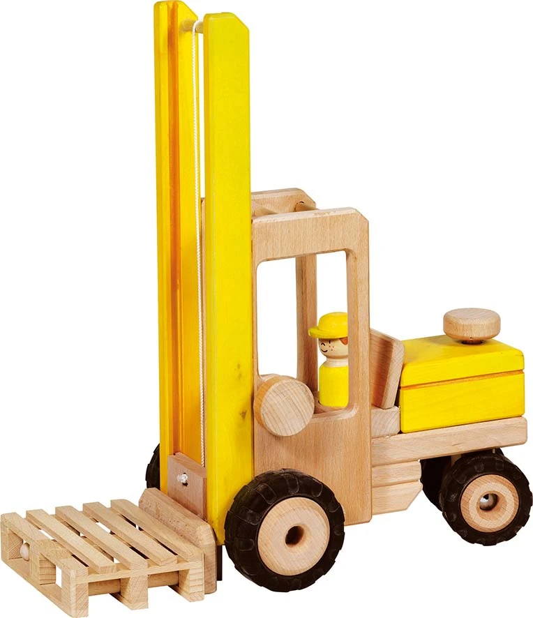 Houten heftruck met stuurbare achteras en traploos verstelbare vork. voorzien van ruber wielen.