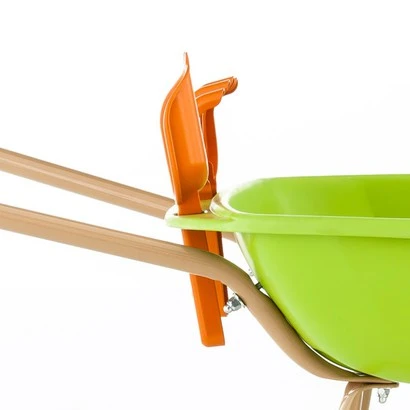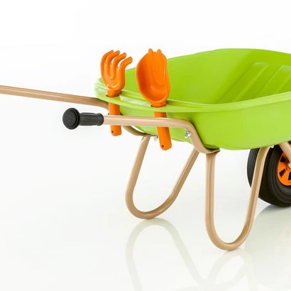Kruiwagen met frame van verzinkte stalen buis en stevige metalen kuip en wiel met breed loopvlak. Voorzien van veiligheidshandvatten. Compleet met schepje en harkje.