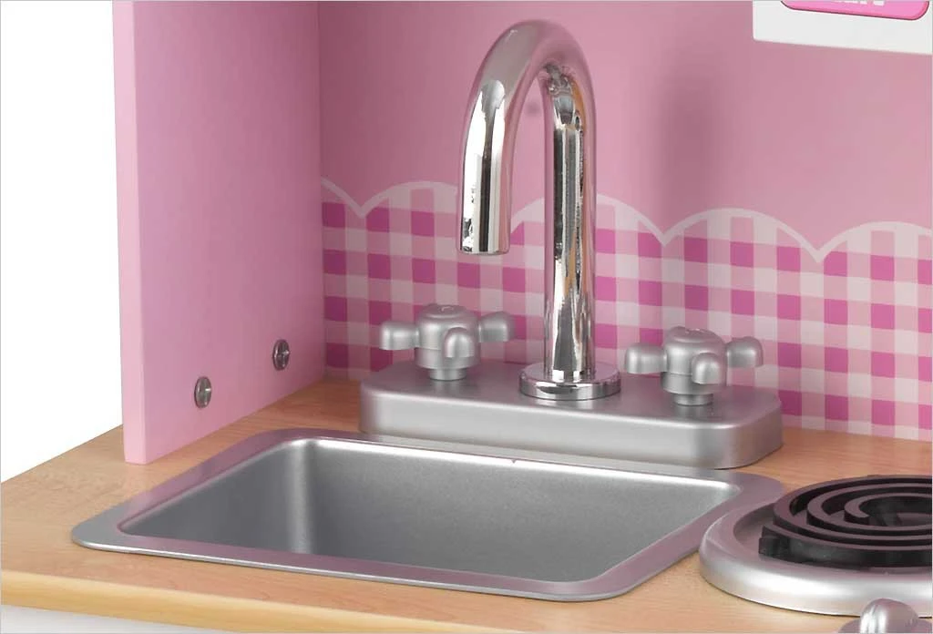 Gezellige houten keuken met nostalgische uitstraling m.n. door het gordijntje onder de gootsteen. Compleet met aanrecht, fornuis, oven en magnetron en grote extra bergruimte onder de keuken.