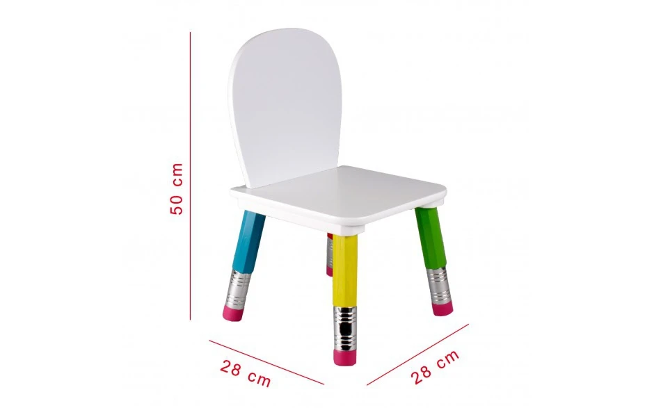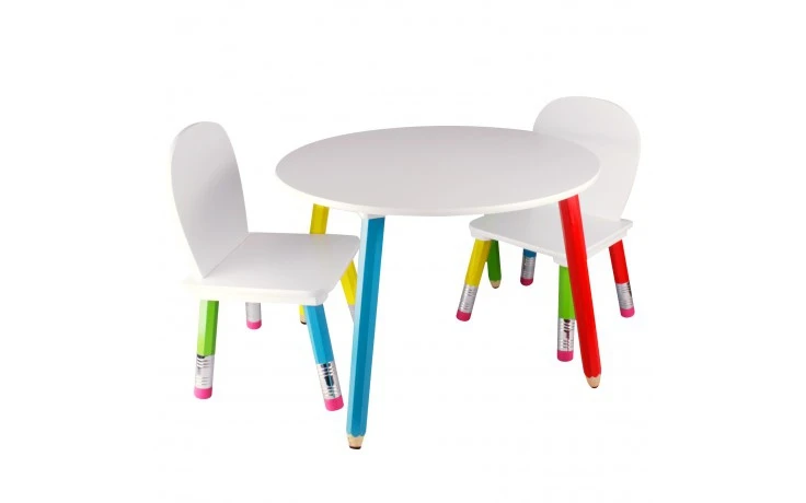 Kindermeubelset bestaande uit een ronde tafel met 2 stoeltjes in een gezellig potlooddesign.