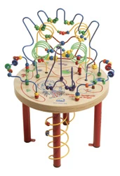Peuters spelen op de vloer met de kralen welke om de poten draaien en 3-4 grotere kinderen spelen tegelijkertijd met de kralenstructuur op de tafel of ze volgen de spaghettislierten die op de tafel zijn afgedrukt.