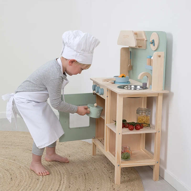 Het Little Dutch keukentje van hout past in iedere woonkamer of speelhoek en is voor elk kind ideaal om mee te spelen. De speelkeuken bestaat uit een oven met deur, een opbergplank, een spoelbak met kraan, een klok en een gasfornuis met twee kookplaatjes. Je kind kan gelijk aan de slag met het passende keukengerei, pannen, ovenwant en een peper en zout stel. De draaiknoppen van het gasfornuis en de oven maken klikgeluiden wanneer je eraan draait. Je kleine chef kan heerlijk bakken en braden in deze complete keuken van Little Dutch.