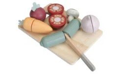 Bevat: een snijplank, een mes, een wortel, een komkommer, een tomaat, een ui, een rode biet en een champignon. Alle groenten kunnen in twee gesneden worden en weer aan elkaar bevestigd worden met het klittenband.