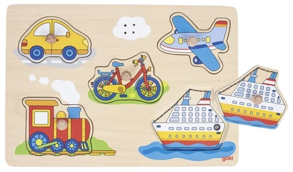 Houten puzzel met 8 voertuigen en de bijpassende geluiden. Wanneer het juiste puzzelstukje ingelegd wordt, klinkt het bijpassende geluid.