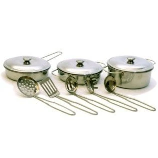 11-delige kookset, bestaande uit 3 pannen en een lepelset.