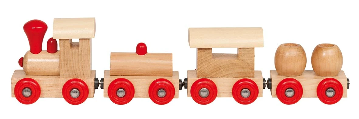 Houten locomotief met 3 wagons. Met magneetkoppeling.